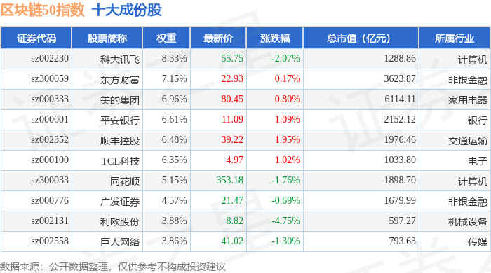 证券之星消息,2月5日,区块链50(399286)指数报收于4227.04点,跌0.6%,成交615.01亿元,换手率3.18%。当日该指数成份股中,上涨的有14家,科大国创以3.77%的涨幅领涨,下跌的有36家,北信源以4.78%的跌幅领跌。