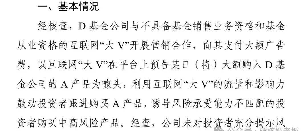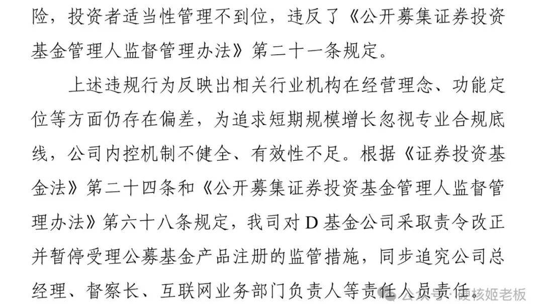 上周五,多家媒体报道: D基金公司与无资质大V开展营销合作等违规行为,要求公司采取责令改正并暂停受理公募基金产品注册的监管措施,且同步追究公司总经理、督察长、互联网业务部门负责人等责任人员责任。