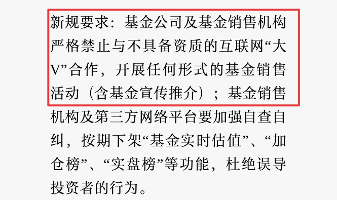 同时,为规范行业发展,“基金公司及基金销售机构严格禁止与不具备资质的互联网大V合作,开展任何形式的基金销售活动(含基金宣传推介)。”