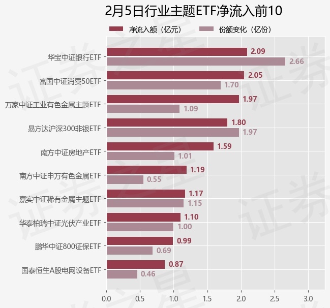 当日有124只行业主题ETF基金出现资金净流入,其中净流入排首位的是华宝中证银行ETF(512800),份额增加了2.66亿份,净流入额为2.09亿元。