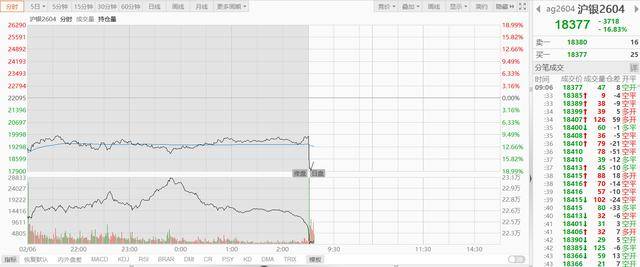 2月6日,白银期货主力合约开盘快速下杀,盘中一度跌近19%,临近跌停,最低触及17900元/千克,距离1月30日最高点32382元/千克,已下跌近45%。截至目前,沪银2604报18377元/千克。
