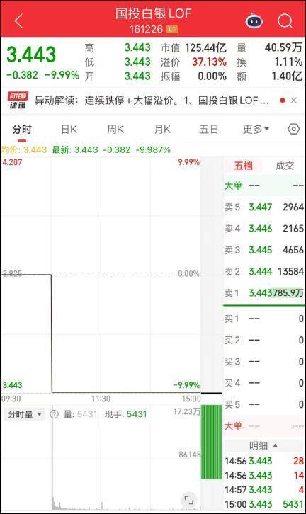 2月5日,国投白银LOF场内开盘触达跌停,截至目前已连续四日跌停,溢价率回落至37.13%。