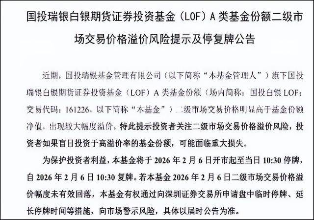 2月5日,国投瑞银基金管理有限公司公告,国投瑞银白银期货证券投资基金(LOF)A类基金份额将于2026年2月6日开市起至当日10:30停牌,自2026年2月6日10:30起复牌。本次停牌系为防范二级市场交易价格大幅溢价风险,保护投资者利益。停牌期间,基金份额申购、赎回业务仍按相关公告执行(本基金自2026年1月28日起暂停申购(含定期定额投资)业务)。
