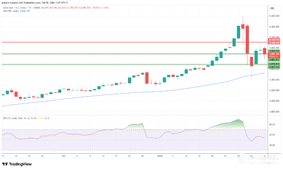 倘若黄金价格跌破4880至4900美元支撑位,则将会向下一支撑位4680至4700美元移动。