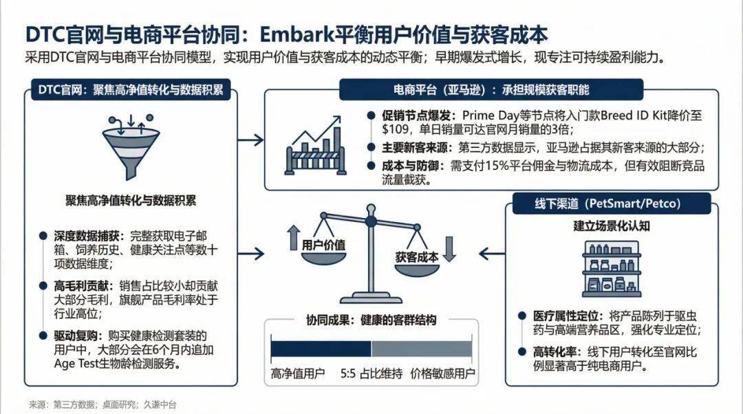 线下渠道则被用来强化专业医疗的定位。在PetSmart和Petco,Embark的产品被特意陈列在驱虫药和高端营养品区域,而不是宠物玩具区。这种场景暗示极大地提升了转化率,最终使得高净值用户与价格敏感用户的比例维持在了健康的5:5。