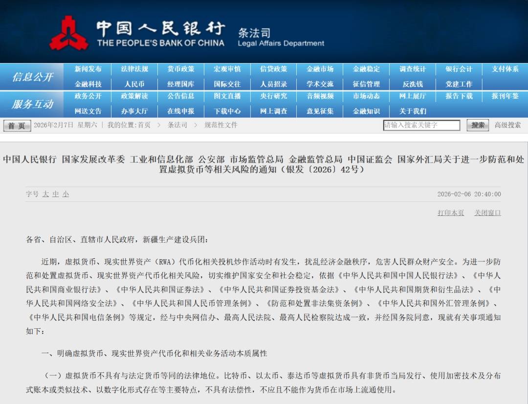 近期,受多种因素影响,虚拟货币、现实世界资产(RWA)代币化相关投机炒作活动时有发生,风险防控面临新形势、新挑战。为进一步完善监管政策,防范和处置相关风险,中国人民银行、中国证监会等八部门联合发布《关于进一步防范和处置虚拟货币等相关风险的通知》(以下简称《通知》),明确在境内虚拟货币相关业务活动属于非法金融活动,禁止境内开展现实世界资产代币化活动。