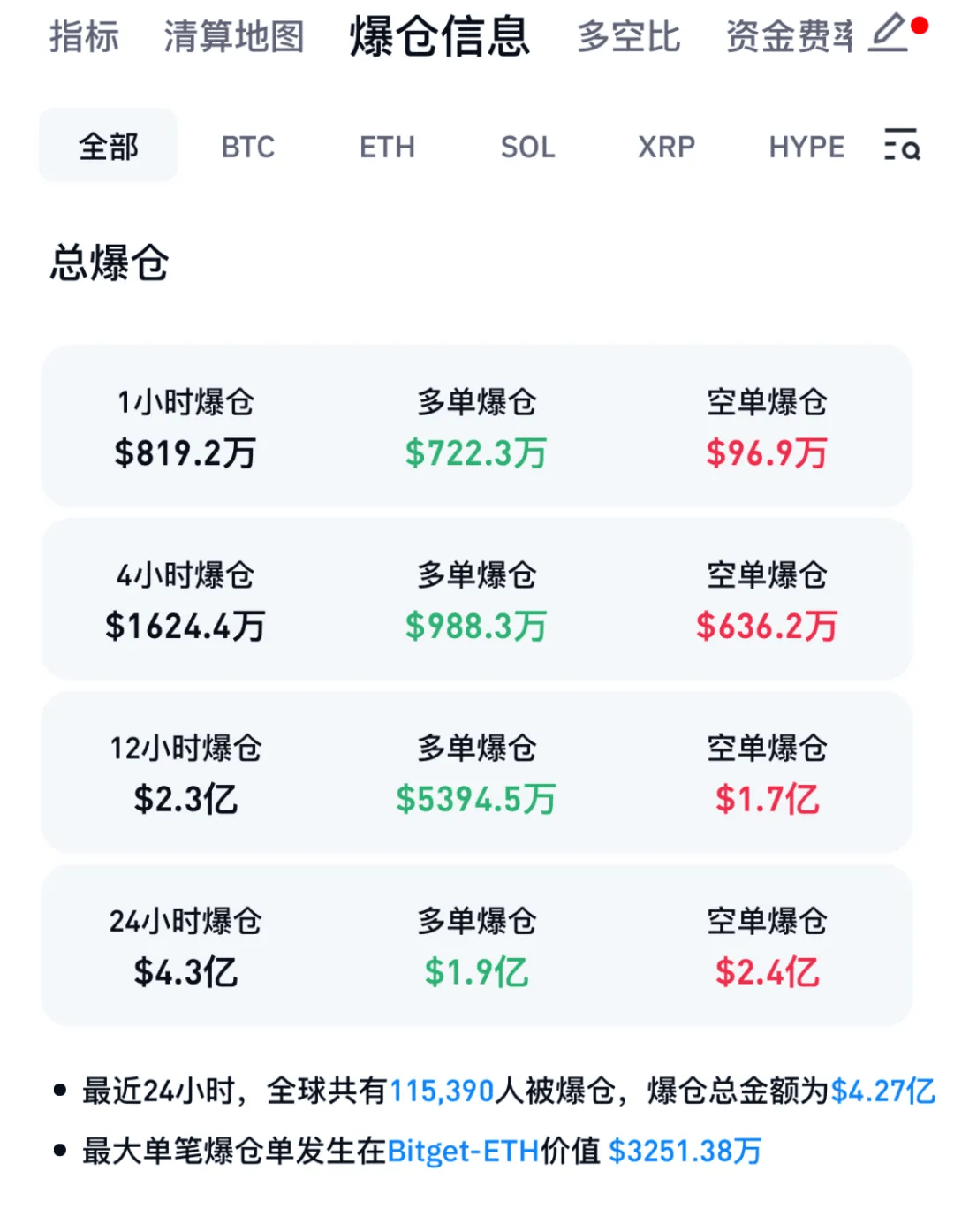 截至目前,比特币价格已跌至69314美元/枚,CoinGlass数据显示,最近24小时,加密货币市场共有超11万人爆仓,爆仓总金额超4亿美元。