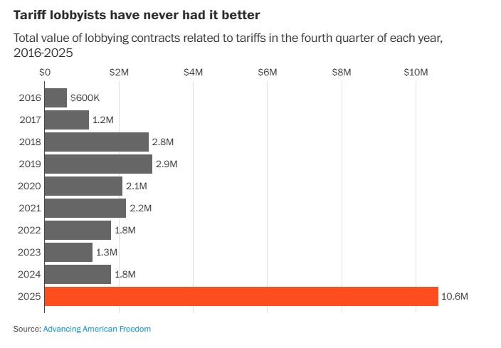 文章认为,由于美国政府实施的一系列新关税,美国去年征收的关税总额约达2885亿美元,较2024年的983亿美元大幅增加。这些由华盛顿精英律师设计、以高度专业和技术性语言实施的关税,为说客们创造了独特的机会,他们向大企业收取高昂费用,以帮助其寻求关税豁免或特殊待遇。而他们自己也赚得盆满钵满。文章援引美国一家基金会的数据,2025年第四季度涉及关税的游说合同价值达1060万美元,而一年前仅为180万美元。