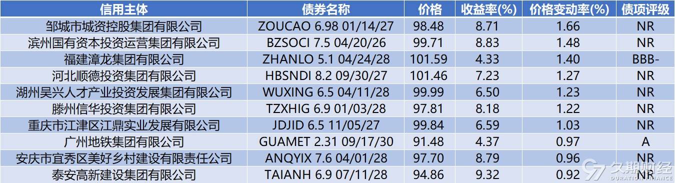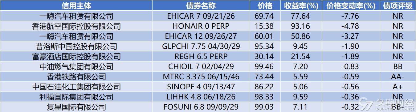 地产板块方面,中国海外发展CHIOLI 4.75 04/26/28(540万美元),领展房产基金LINREI 4.875 02/02/36(524万美元),雅居乐集团AGILE 5.75 01/02/25(400万美元),万科企业VNKRLE 3.975 11/09/27(320万美元)。