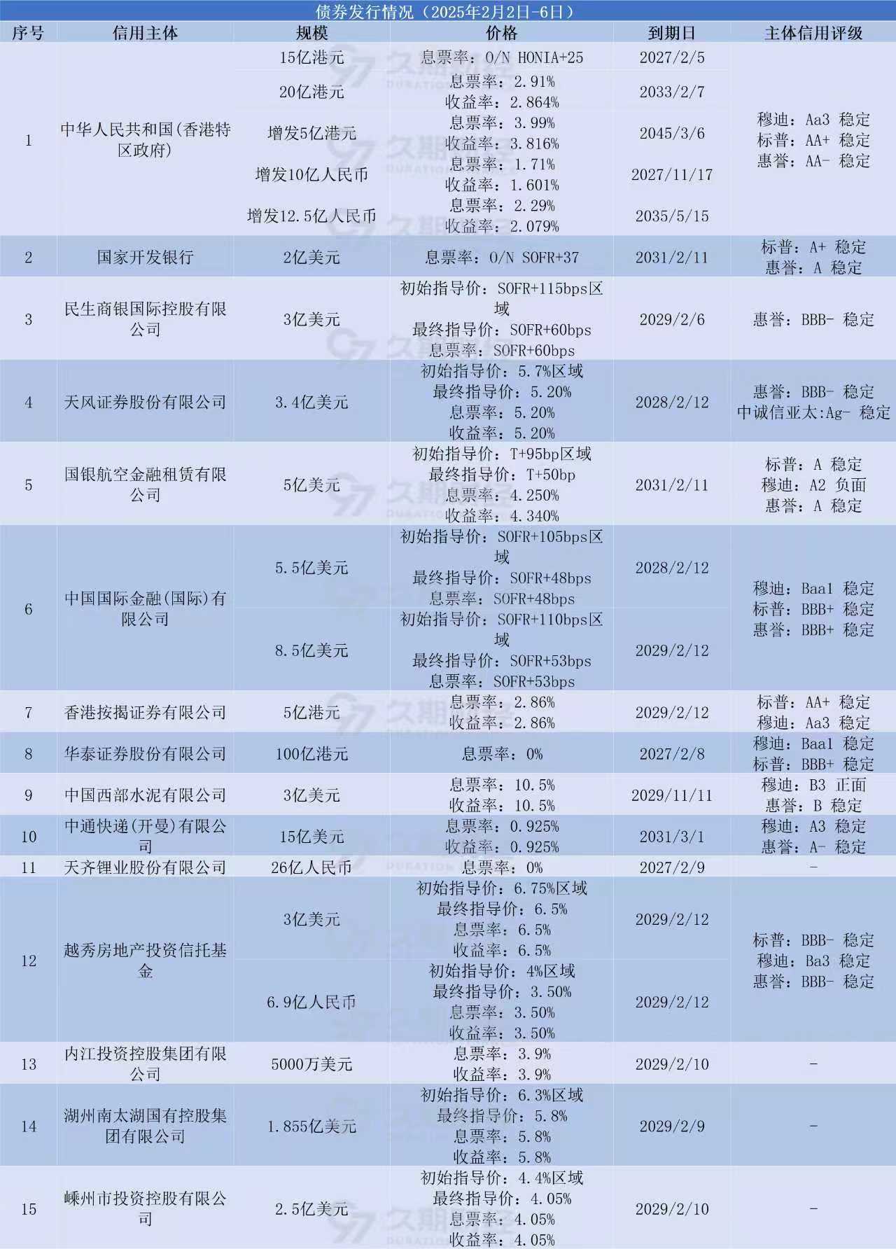 华泰证券发行100亿港元(约12.8亿美元)零息可转债,为过去十年国内证券行业规模最大的再融资及股权挂钩类发行,也是过去八年来香港特区市场规模最大的363天期限可转债发行。本次初始转换价为每股H股19.70港元,较2月2日公司H股收市价每股18.45港元溢价约6.78%。民银国际担保发行3亿美元浮息债券,本次交易最终定价SOFR+60bps,较初始价格指引收窄55个基点。