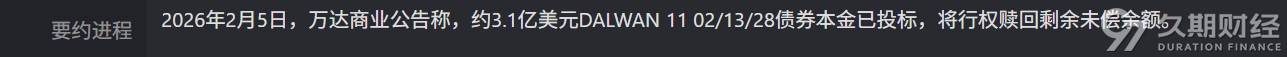 万达商业发布公告,要约人已接受286,472,000美元DALWAN 11 02/13/28本金及23,455,000美元仅投标债券本金的投标,交割日预计为2月9日。此外,要约人将于2月25日("选择性赎回日")按本金金额赎回所有未偿债券,并支付截至(但不含)选择性赎回日的应计未付利息。
