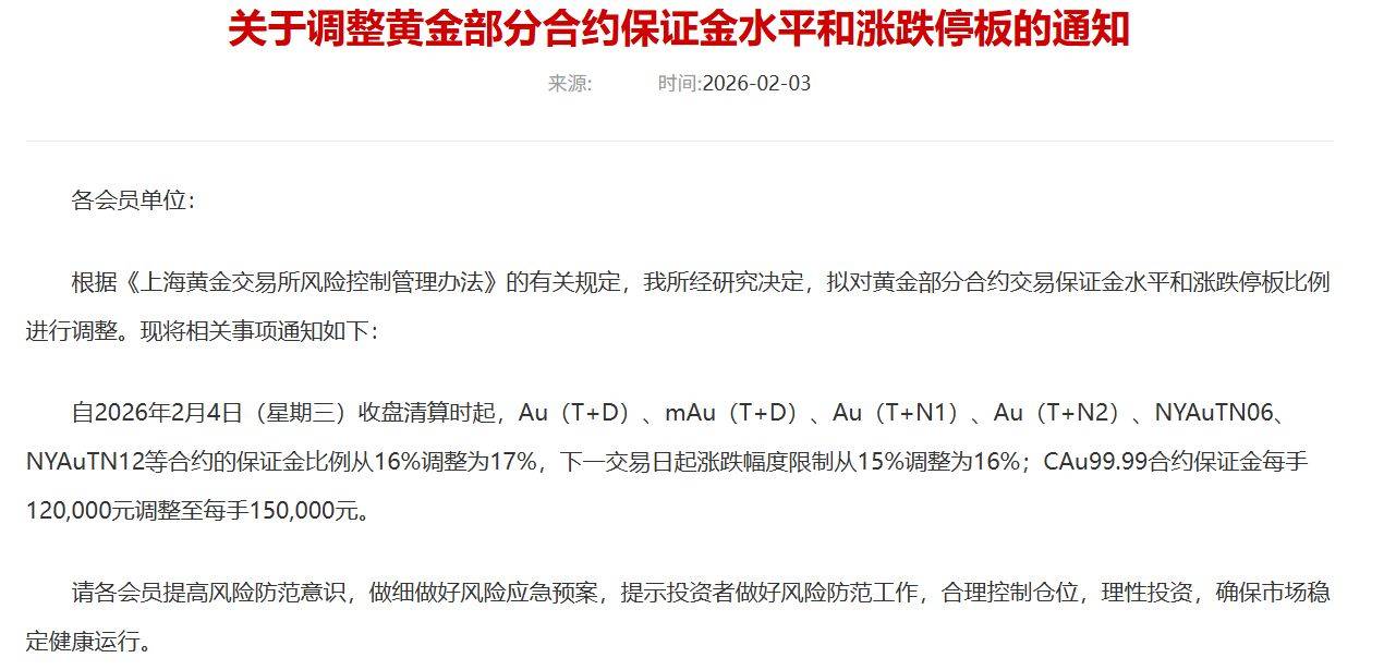 同日,上交所还发布公告称,自2026年2月4日(星期三)收盘清算时起,Au(T+D)、mAu(T+D)、Au(T+N1)、Au(T+N2)、NYAuTN06、NYAuTN12等合约的保证金比例从16%调整为17%,下一交易日起涨跌幅度限制从15%调整为16%;CAu99.99合约保证金每手120,000元调整至每手150,000元。