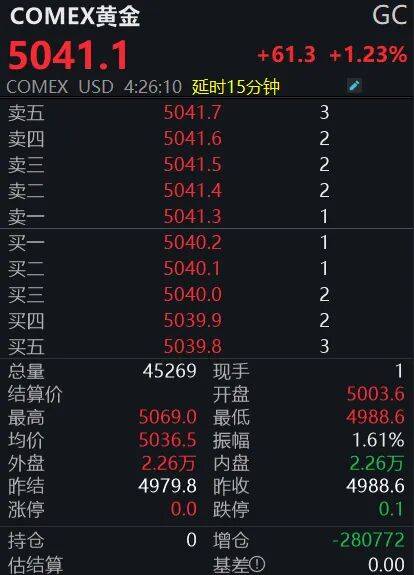 期货市场同步拉升。截至发稿,COMEX黄金期货日内上涨1.23%,交投于5040美元/盎司附近,盘中最高触及5069美元/盎司;COMEX白银期货大涨5.94%,报81.465美元/盎司,最高触及82.125美元/盎司。