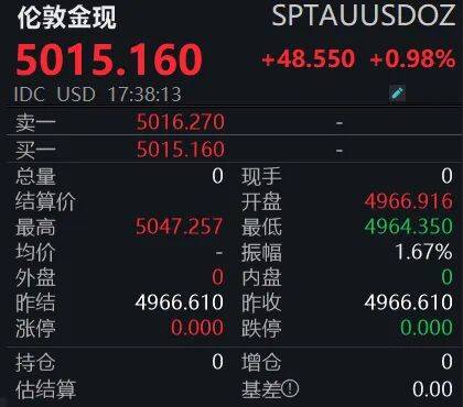 截至记者发稿,伦敦金现日内上涨0.98%,报5015.16美元/盎司,盘中最高触及5047.257美元/盎司。伦敦银现日内大涨4.78%,报81.501美元/盎司,最高报82.46美元/盎司,涨幅依旧在黄金之上。