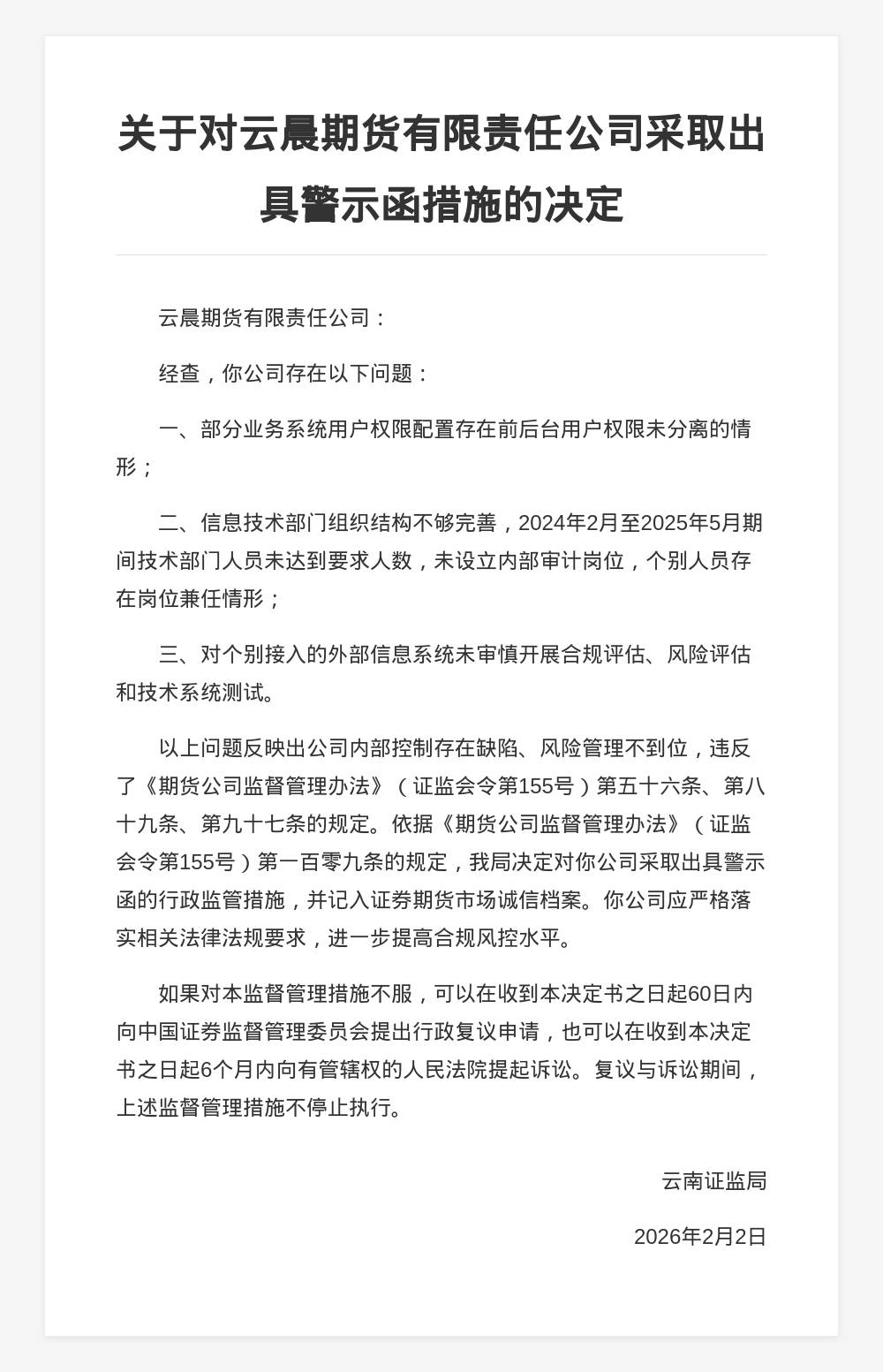以上问题反映出公司内部控制存在缺陷、风险管理不到位,违反了《期货公司监督管理办法》的规定。云南证监局决定对云晨期货采取出具警示函的行政监管措施,并记入证券期货市场诚信档案。