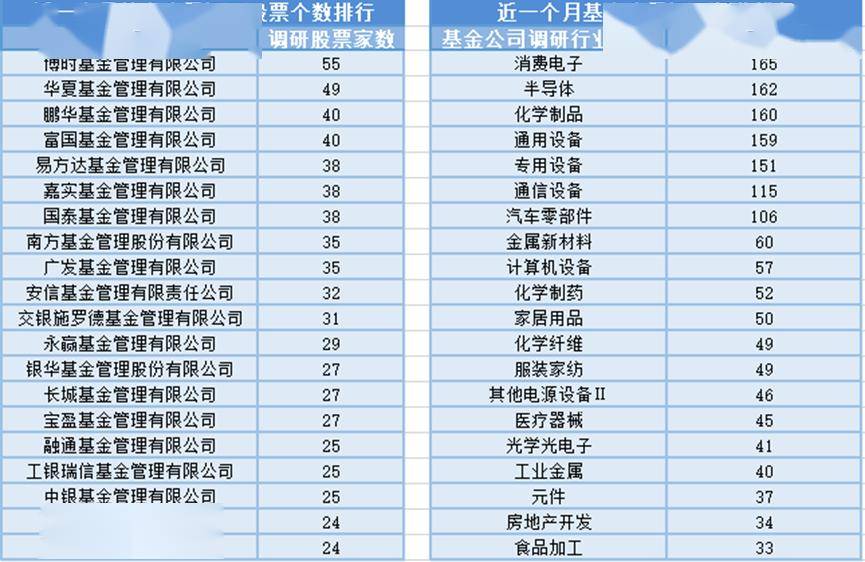 近一个月(1月11日-2月10日),博时基金参与公司调研的数量最多,共调研55家上市公司,此外调研较为活跃的还有华夏基金、鹏华基金和富国基金,分别调研49家、40家、40家上市公司;从调研行业上来看,基金公司对消费电子行业的上市公司调研次数最多,共有165次,其次是半导体行业,基金公司调研了162次。