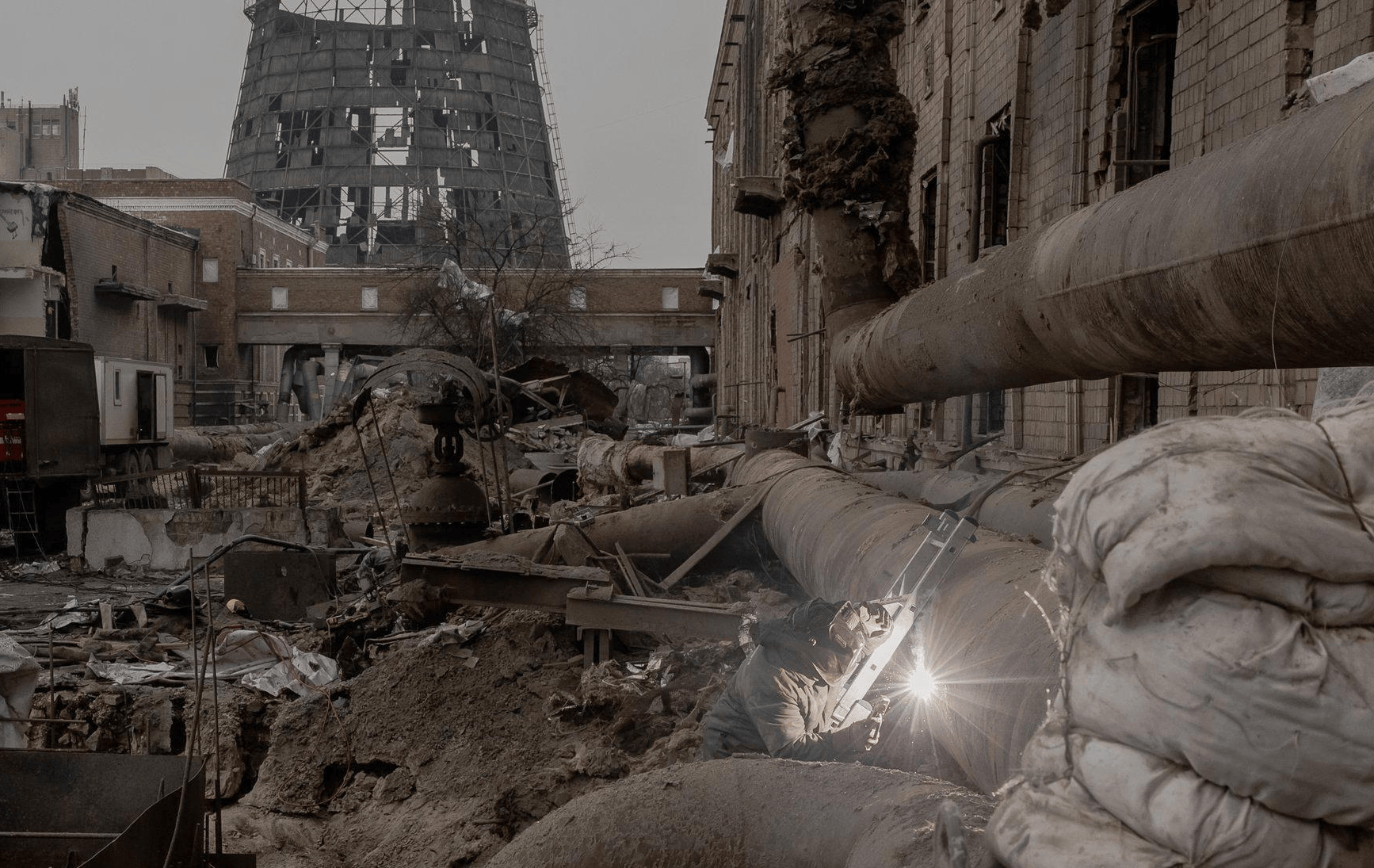 2月3日遭到袭击的达尔尼察热电厂严重受损。该热电厂为1100多户乌克兰家庭供暖;为了防止冻住,水排干。