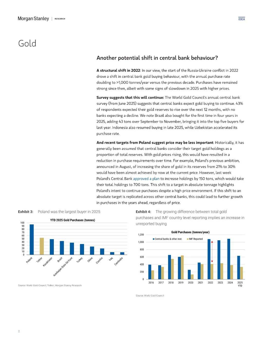 全球央行正在重新定义黄金在官方储备中的角色,这一转变构成了当前牛市最坚实的结构性支撑。自2022年地缘冲突爆发以来,年购金量已翻倍至超1000吨水平,但更值得关注的不是数量的激增,而是决策逻辑的深刻变迁。传统上,市场普遍假设央行以黄金占储备的比例作为配置基准,这意味着价格上涨本应自动抑制购买需求。然而波兰央行的最新举措彻底打破了这一认知——该国在已将黄金占比从21%提升至接近30%目标的情况下,仍批准额外增持150吨至总量700吨,明确将目标从"比例"转向"绝对吨位"。这种对高价格环境的主动容忍,暗示着美元信用体系重构背景下,主权财富管理机构对黄金的战略配置正在超越简单的成本考量。世界黄金理事会的调查进一步印证了这一趋势,43%的受访央行计划未来12个月继续增持,而IMF官方数据与全球实际购买量之间的持续背离,更暗示大量未被公开的"隐秘购买"正在悄然吸收市场供给。