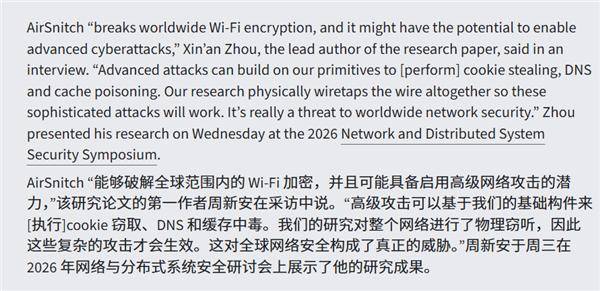 根据美国加州大学的研究报告,AirSnitch攻击导致全球Wi-Fi用户的客户端隔离机制几乎在一夜之间被彻底瓦解,且目前尚无有效的技术补救措施。