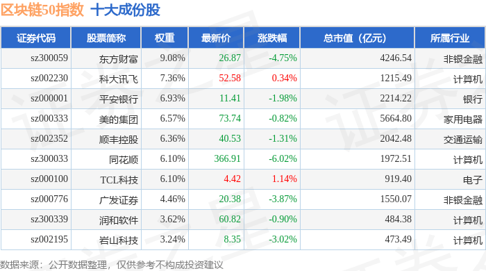 证券之星消息,9月18日,区块链50(399286)指数报收于4252.21点,跌1.83%,成交1174.72亿元,换手率5.7%。当日该指数成份股中,上涨的有10家,东华软件以7.19%的涨幅领涨,下跌的有39家,同花顺以6.02%的跌幅领跌。
