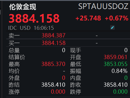 【大河财立方消息】10月1日消息,现货黄金刚刚短线走强,突破3880.00美元/盎司关口。截至发稿,报3884.158美元/盎司,日内涨0.67%。