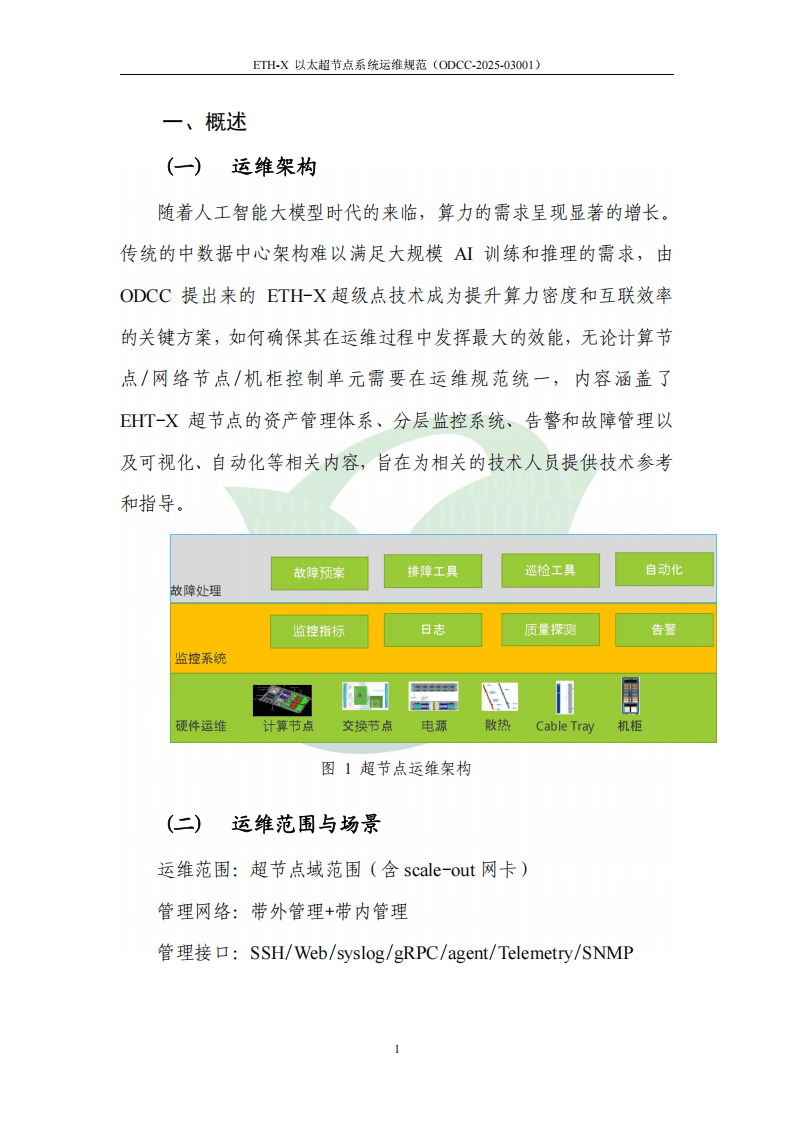 随着人工智能大模型技术的飞速发展,算力需求呈爆发式增长,传统数据中心架构已难以满足大规模AI训练与推理的高效运行需求。近日,开放数据中心委员会(ODCC)发布《ETH-X以太超节点系统运维规范》(编号ODCC-2025-03001),针对ETH-X以太超节点这一提升算力密度与互联效率的关键设施,构建了覆盖硬件资产全生命周期的标准化运维框架,为复杂的超节点运维工作提供了全面指引。