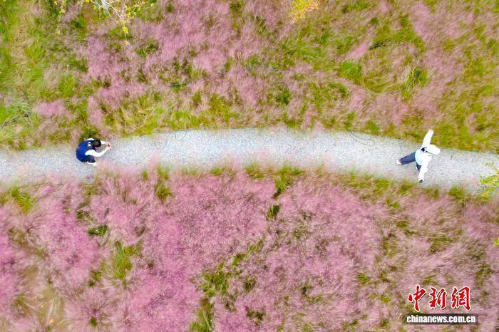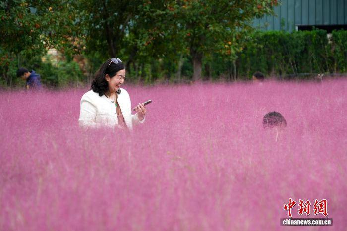 10月3日,河南郑州黄河大堤万滩段,盛开的粉黛乱子草吸引了众多游人前来观赏,人们走在粉色花海中感受秋天的景色。中新社记者 范晓恒 摄