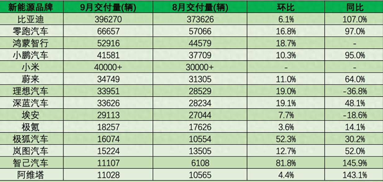 在这样的背景之下,绝大部分的车企,在9月份都创造了交付纪录,大家同比、环比都是大增,毕竟金九银十嘛,9月是一个卖车的好月份。