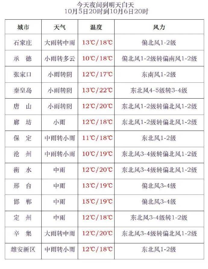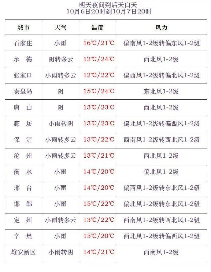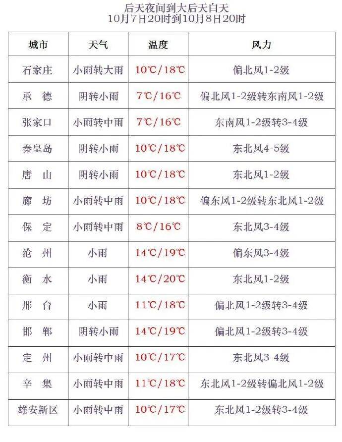 今天傍晚到夜间,全省阴,保定、廊坊及以南地区有中到大雨,个别地点有暴雨,其他地区有小雨。最低气温,张家口北部、承德、秦皇岛北部、保定西北部2~10℃,其他地区11~14℃。