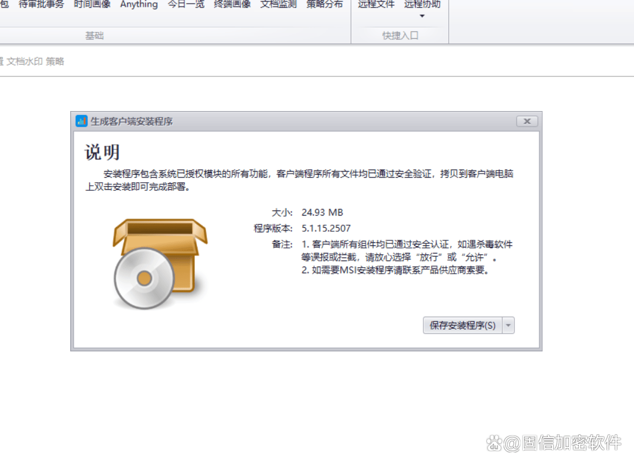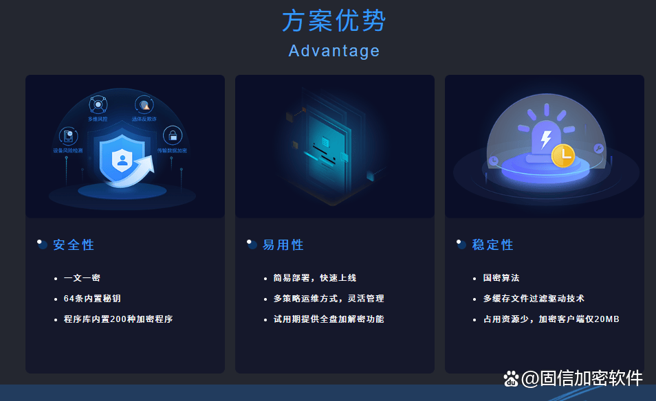 以透明加密技术为核心,覆盖文档、图纸、代码等多类型敏感数据类型。精细化权限管理。通过集中终端控制平台实现加密策略统一部署(纯软部署),且客户端安装包业内最小(只有20mb),支持多种安装效果。