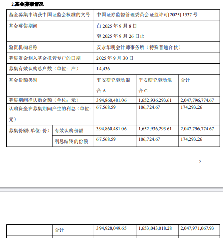 募集期间净认购金额2,047,796,774.67元,认购资金在募集期间产生的利息174,293.26元,募集份额合计2,047,971,067.93份。