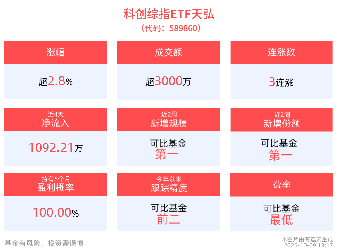 截至9月30日,科创综指ETF天弘(589860)近2周规模增长1866.52万元,近2周份额增长1200.00万份,实现显著增长,新增规模、份额均位居可比基金第一。