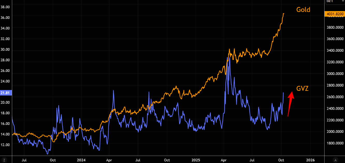 据The Market Ear分析,Cboe黄金波动指数(GVZ)升至近期高位,而历史数据显示黄金往往在波动性大幅上升后进入暂停或调整阶段。