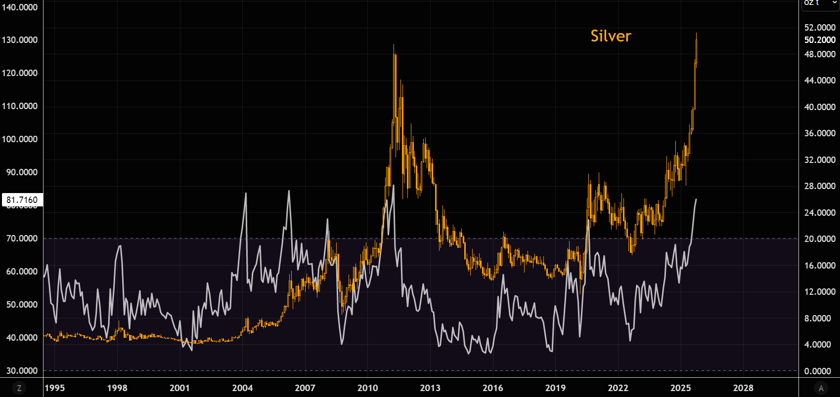 白银月线RSI则达到2011年恐慌性上涨以来的最高水平。