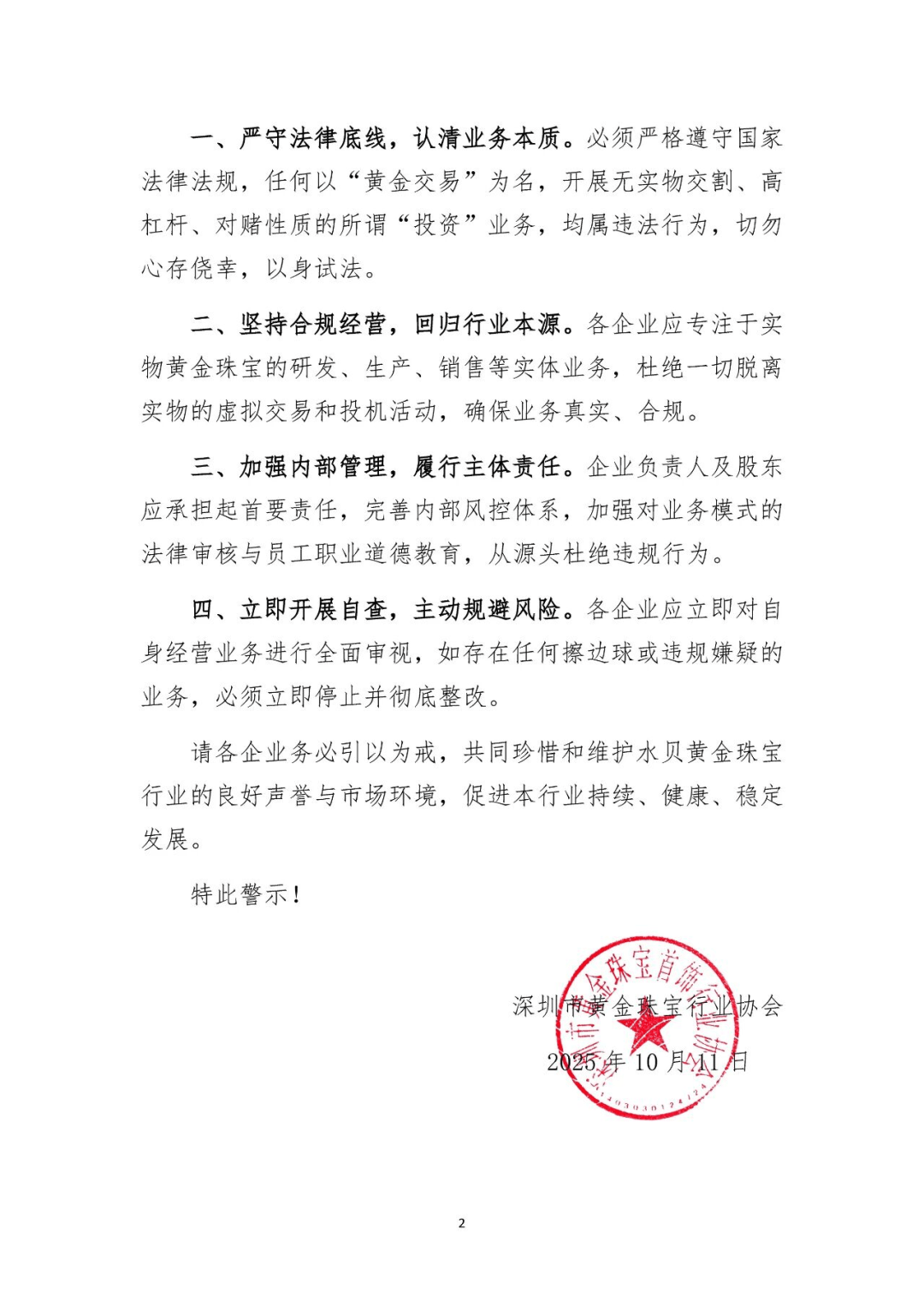 为遏制行业乱象,维护市场秩序,深圳市黄金珠宝首饰行业协会向全体会员及行业企业发出四点警示:
