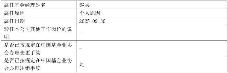 10月1日,申万菱信基金发布公告称,基金经理赵兵因个人原因离任申万菱信中证军工指数基金、申万菱信中证A500ETF基金、申万菱信沪深300价值ETF基金、申万菱信中证A500ETF联接基金、申万菱信沪深300价值指数基金、申万菱信沪深300价值ETF联接基金等6只产品。此后,赵兵名下再无其他在管基金。