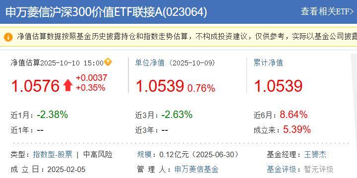 天天基金网数据显示,截至10月9日,申万菱信沪深300价值ETF联接A基金成立以来的单位净值增长5.39%,近3个月的单位净值下跌2.63%,近1个月的单位净值下跌2.38%。