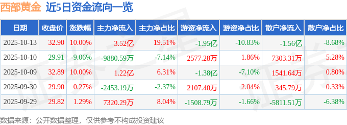 证券之星消息,截至2025年10月13日收盘,西部黄金(601069)报收于32.9元,上涨10.0%,换手率6.38%,成交量56.62万手,成交额18.02亿元。