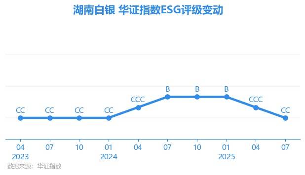 日前,华证指数公布了新一期(2025年7月31日)的ESG评级结果,湖南白银(002716.SZ)获得CC评级(华证指数评级为C起至AAA九档,C为最低档,AAA为其最高一级评级/AA为其第二档),上一期(2025年4月30日)ESG评级为CCC。本期ESG评级在196家金属与采矿行业A股上市公司中排名第167(上一期排名第164)。
