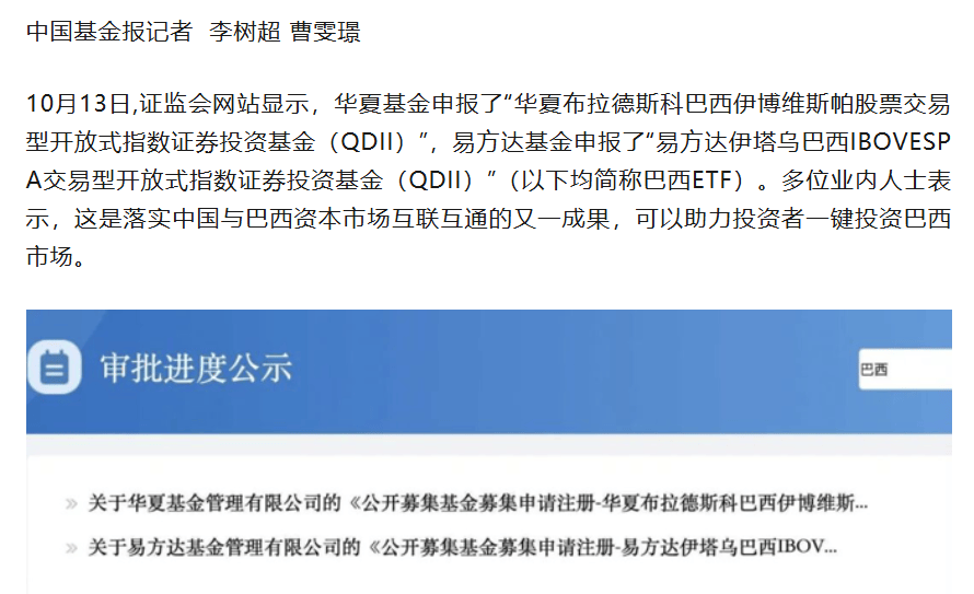 中国基金报此前报道,华夏基金也曾同步上报“华夏布拉德斯科巴西伊博维斯帕ETF”,与巴西布拉德斯科银行(Bradesco)合作对接。但截至10月14日,《财中社》在证监会基金募集申请公示进度中未见该产品名称,疑似已撤回或暂缓披露。