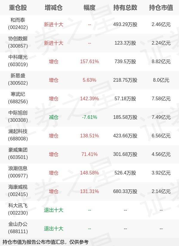 证券之星消息,10月15日华富基金旗下张娅 郜哲 李孝华管理的华富中证人工智能产业交易型开放式指数基金公布三季报,近1年净值增长率80.56%。与上一季度相比,该基金前十大重仓股新增和而泰,协创数据;并对中科曙光增仓452.44万股,为该基金第一大重仓股;科大讯飞,金山办公等退出前十大重仓股;详细数据如下: