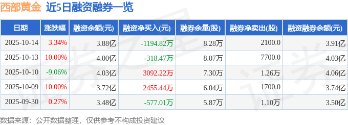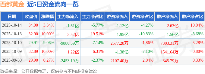 证券之星消息,截至2025年10月14日收盘,西部黄金(601069)报收于34.0元,上涨3.34%,换手率8.49%,成交量75.34万手,成交额26.14亿元。