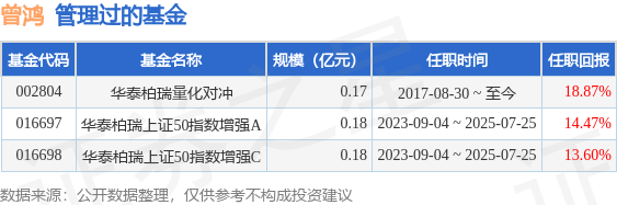 曾鸿先生:复旦大学世界经济学硕士。2013年7月加入华泰柏瑞基金管理有限公司,任量化投资部研究员。2017年8月起任华泰柏瑞量化对冲稳健收益定期开放混合型发起式证券投资基金的基金经理。2023年9月4日担任华泰柏瑞上证50指数增强型证券投资基金基金经理。