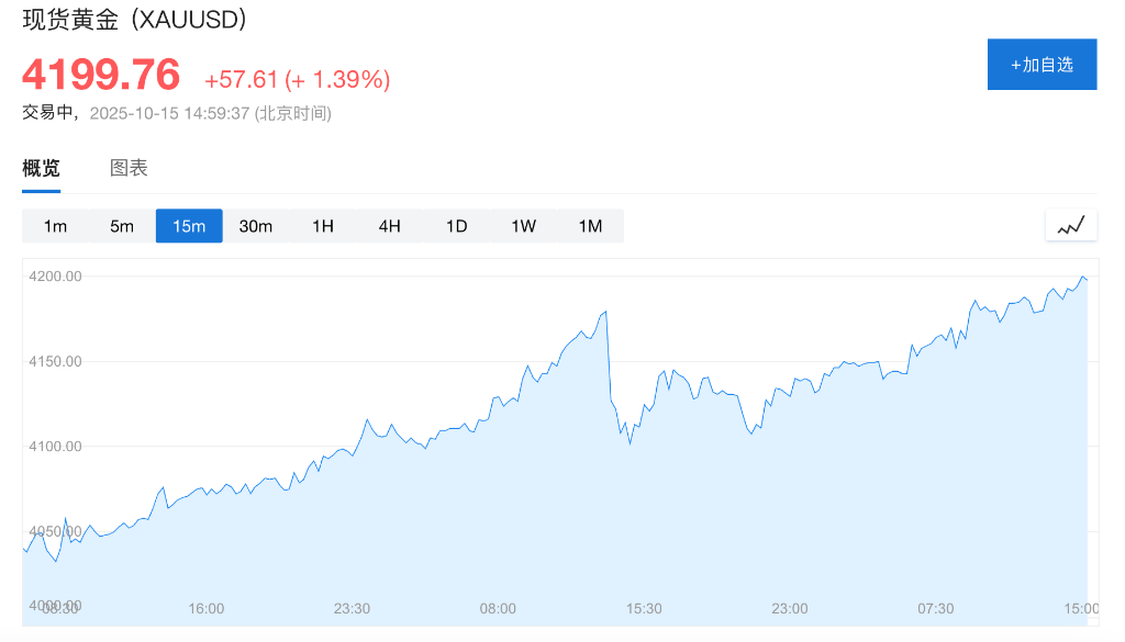 现货黄金突破4200美元/盎司,日内涨近1.4%。市场预期美联储年内还将两度降息,加上特朗普最新贸易言论点燃避险情绪,共同推高黄金的避险买盘。