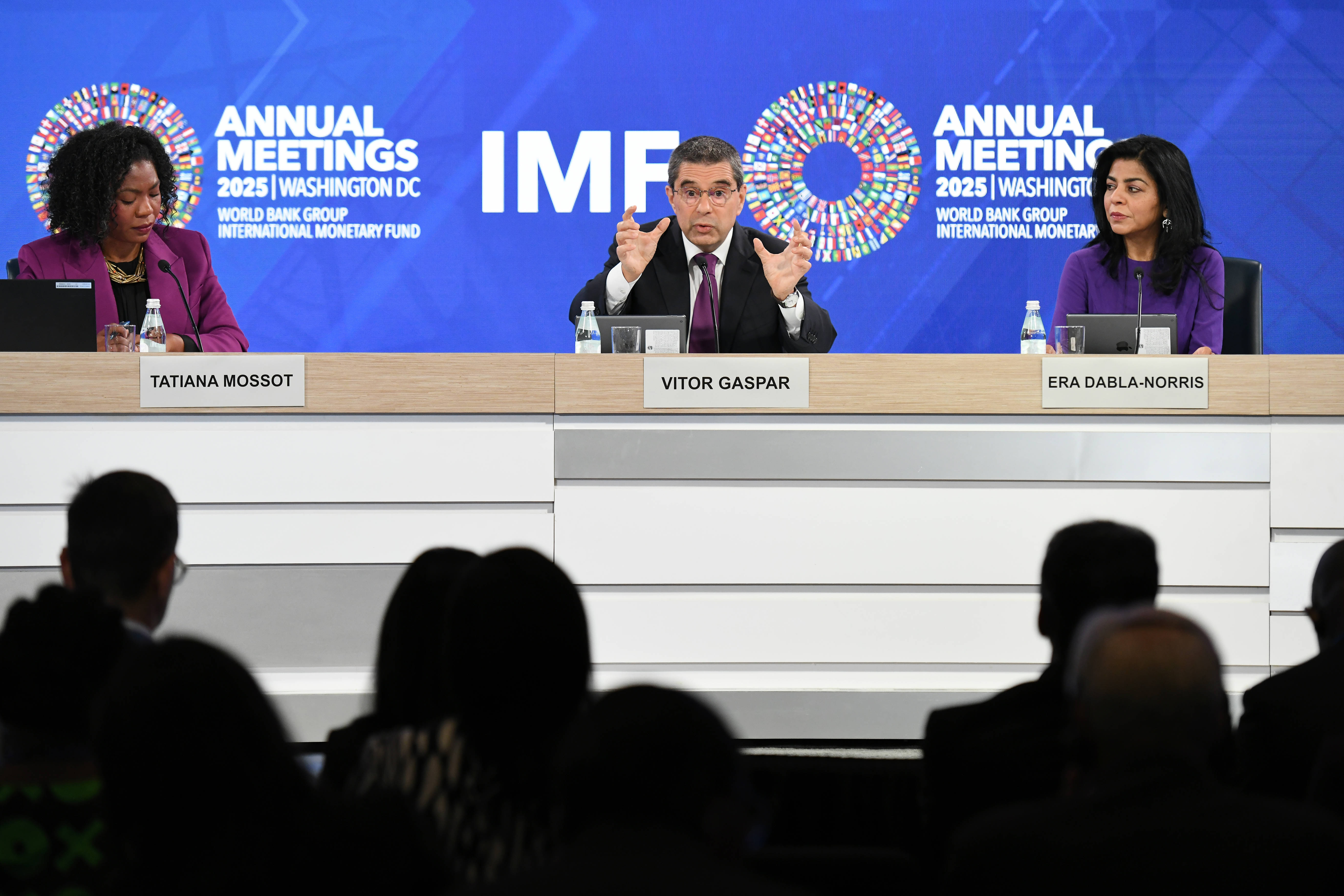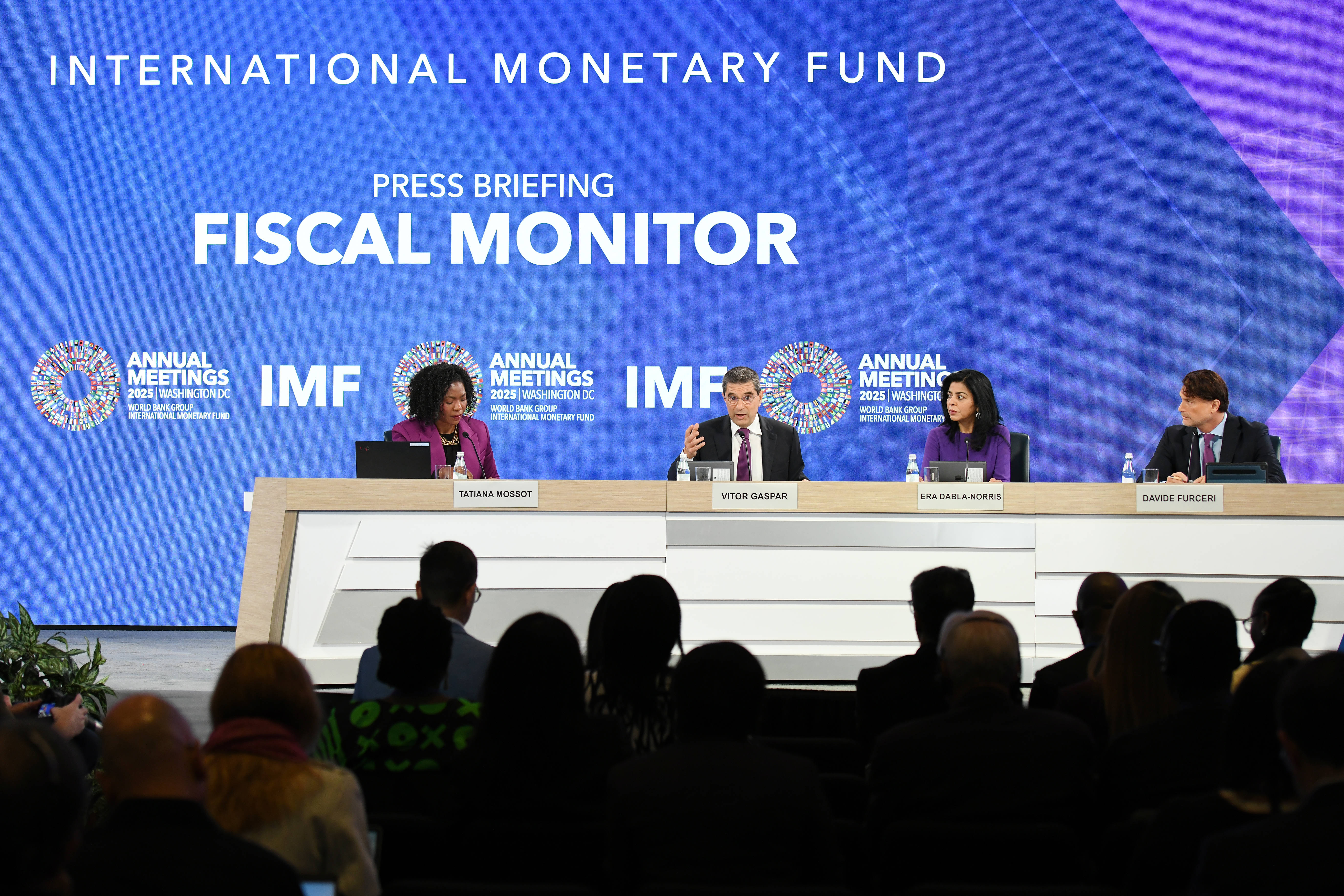 10月15日,在美国华盛顿,国际货币基金组织财政事务部主任维托尔·加斯帕尔(中)在《财政监测报告》新闻发布会上讲话。 新华社记者 李睿 摄