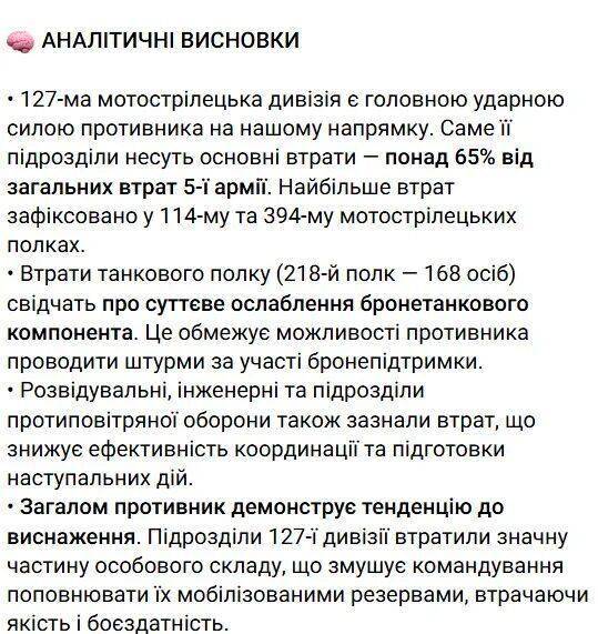 10月9日,乌克兰第110独立机械化旅在其Telegram频道上表示:“(俄军)第127摩托化步兵师仍然是俄军在新帕夫利夫卡方向的主要突击力量……该师部队损失惨重,占第五集团军总损失的65%以上。损失最大的是第114和第394摩托化步兵团……总体而言,敌方部队正呈现疲态。第127师的部队损失了相当一部分人员,这迫使指挥部不得不补充动员,并降低其战备水平。”不过,其中并未提及“俄军成建制投降”。