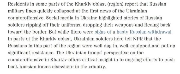 另据美国国家公共广播电台2022年9月29日报道,尽管有迹象表明俄罗斯在哈尔科夫州部分地区仓促撤退,但这里的乌克兰士兵表示,该地区的俄罗斯军队已经做好了充分准备,装备精良,并进行了顽强的抵抗。