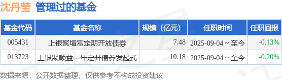 沈丹莹女士:中国国籍,硕士研究生。现任上银基金基金经理助理。曾任上银基金固收助理研究员、固收交易员、固收研究员等职务。2025年7月28日起任上银慧财宝货币市场基金基金经理助理。2025年9月4日担任上银聚顺益一年定期开放债券型发起式证券投资基金、上银聚增富定期开放债券型发起式证券投资基金基金经理。