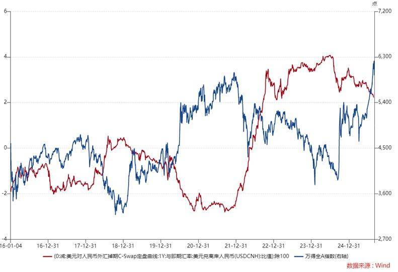 展望后市,A股整体下行空间或较为有限。今年以来,人民币持续走强,对市场风险偏好的提振作用明显。与前几年相比,汇率成为影响A股表现的关键外生变量。考虑到汇率本身的绝对值易受外部扰动,跨期可比性较弱,引入外汇掉期与中美汇率比值指标,更能从相对视角衡量中美货币的吸引力变化。从该指标走势来看,今年以来美元相对人民币的吸引力持续下降,并在趋势上确认结束了自2021年9月以来长达三年的上升周期。