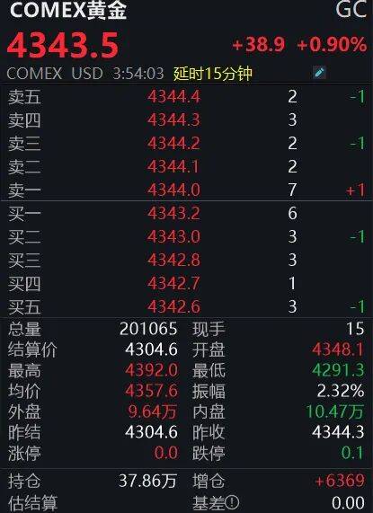期货方面,COMEX黄金期货亦实现大涨。截至记者发稿,COMEX黄金期货日内涨0.9%,报4343.5美元/盎司,盘中最高触及4392美元/盎司,亦创下历史新高。